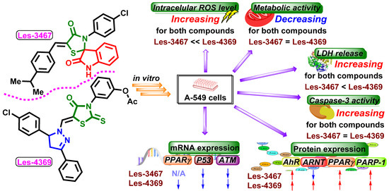 Among the different chemotypes of 4-thiazolidinone hybrids, pyrazoline- and indoline-bearing molecules draw attention as candidates to be used for the design of potential multi-target anticancer agents and in-depth studies of their pharmacological properties [6,15,39,40]. Therefore, this study aimed to investigate the new 4-TZD-based derivatives (Z)-5-[5-(4-chlorophenyl)-3-phenyl-4,5-dihydropyrazol-1-ylmethylene]-3-(3-acetoxyphenyl)-2-thioxothiazolidin-4-ones (Les-4369) and (5′Z)-3′-(4-chlorophenyl)-5′-[(4-isopropylphenyl)methylene]spiro[indoline-3,2′-thiazolidine]-2,4′-dione (Les-3467) (Figure 1) in terms of their anticancer effects and potential PPARγ modulatory properties.