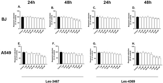 Metabolic activity of increasing concentrations of Les-3467 (A,B,E,F) and Les-4369 (C,D,G,H) (1 nM–100 μM) in the A549 cancer cell line and the BJ normal cell line after 24 h (A,E,C,G) and 48 h (B,F,D,H). The statistical significance of each data point was analyzed by Tukey’s test using one-way ANOVA for each study group; * p < 0.05, ** p < 0.01, and *** p < 0.001, compared with control cells.