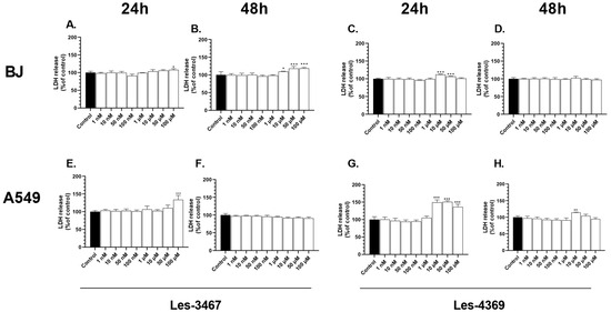 LDH release level at increasing concentrations of Les-3467 (A,B,E,F) and Les-4369 (C,D,G,H) (1 nM–100 μM) in the A549 cancer cell line and the BJ normal cell line after 24 h (A,E,C,G) and 48 h (B,F,D,H). The statistical significance of each data point was analyzed by Tukey’s test using one-way ANOVA for each study group; * p < 0.05, ** p < 0.01, and *** p < 0.001, compared with control cells.