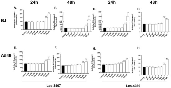 Caspase-3 activity at increasing concentrations of Les-3467 (A,B,E,F) and Les-4369 (C,D,G,H) (1 nM–100 μM) in the A549 cancer cell line and the BJ normal cell line after 24 h (A,E,C,G) and 48 h (B,F,D,H). The statistical significance of each data point was analyzed by Tukey’s test using one-way ANOVA for each study group; * p < 0.05, ** p < 0.01, and *** p < 0.001, compared with control cells.