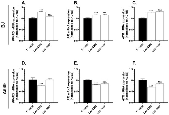 After the 24 h exposure, the mRNA expression in the BJ and A549 cells was examined for the concentration of 1 μM of Les-3467 or 1 µM Les-4369. In the BJ cells, Les-4369 induced a significant 28.72% increase in the PPARG mRNA expression, while the Les-3467 compound increased the PPARG mRNA expression by 7.70%, compared to the control (Figure 9A). The P53 mRNA expression increased significantly by 15.59% in the Les-4369 variant and by 15.60% in the Les-3467 treatment, compared to the control (Figure 9B). In the case of the ATM mRNA expression, Les-4369 increased this parameter by 25.50%, compared to the control. The Les-3467 compound increased the ATM mRNA expression by 30.57%, compared to the control (Figure 9C).