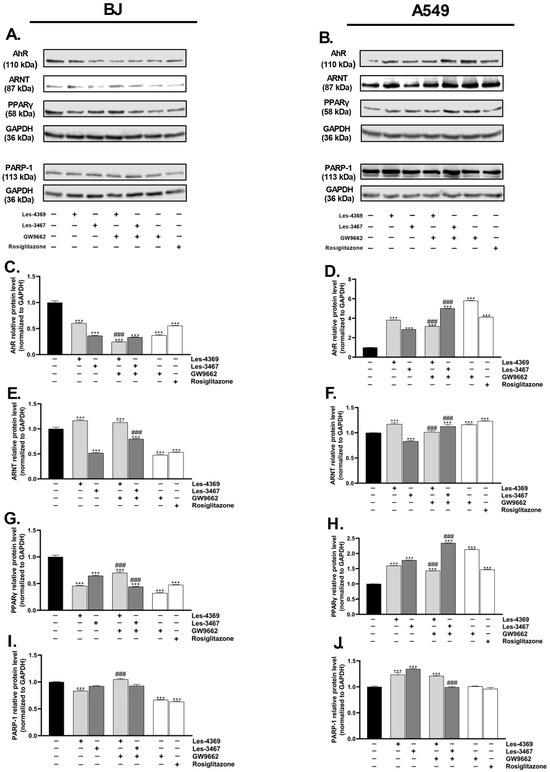 Representative Western blot of AhR, ARNT, PPARγ, and PARP-1 protein levels from BJ (A) and A549 (B) cells treated with 1 µM Les-4369 and Les-3467, 1 µM GW9662, 1 µM rosiglitazone, and co-treatment with Les-4369 and GW9662 or Les-3467 and GW9662. Western blotting bands for levels of AhR (C,D), ARNT (E,F), PPARγ (G,H), and PARP-1 (I,J) protein expression in BJ after 24 h treatment. The blots were stripped and reprobed with anti-GAPDH antibodies to control the amounts of protein loaded onto the gel. The statistical significance of each data point was analyzed by Tukey’s test using one-way ANOVA for each study group; *** p < 0.001 versus the control group; ### p < 0.001 versus the GW9662-stimulated group.