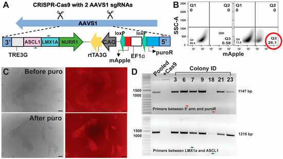 Integration of transcription factors and selection of iPSC colonies. (A) Using CRISPR-Cas9, the cassette containing the 3 human transcription factors (ASCL1, LMX1A, and NURR1), the puroR gene, and the mApple selection marker were integrated into the AAVS1 safe harbour locus of iPSCs. (B) After the CRISPR-Cas9 edit of iPSCs, FACS was used to isolate the mApple-positive iPSCs (>25%). The left panel shows the FACS gating of the iPSCs with no mApple and the right panel shows the percent mApple-positive iPSCs based on the gating from the left panel. FlowJo (v10.10.0) was used to generate the FACS images. (C) The mApple-positive sorted iPSCs were used to pick colonies manually, which were treated with puromycin to obtain a purer population of mApple-positive iPSCs. Scale bar 100 μm. (D) The FACS and puromycin-treated iPSC colonies were genotyped using PCR, amplifying a partial region of the 5′ arm and the puroR (red arrows) and a partial region of the LMX1a and the ASCL1 transcription factors (green arrows). Also refer to (A) for the position of the primers indicated by the red and the green arrows. DNA gel showing ladder in lane 1, pooled iPSCs (before colony picking) in lane 2, Cas9-only iPSCs (no hALAN integration) in lane 3, and colonies with positive/negative PCR bands in the following lanes. The numbers above the lanes represent colony ID numbers.