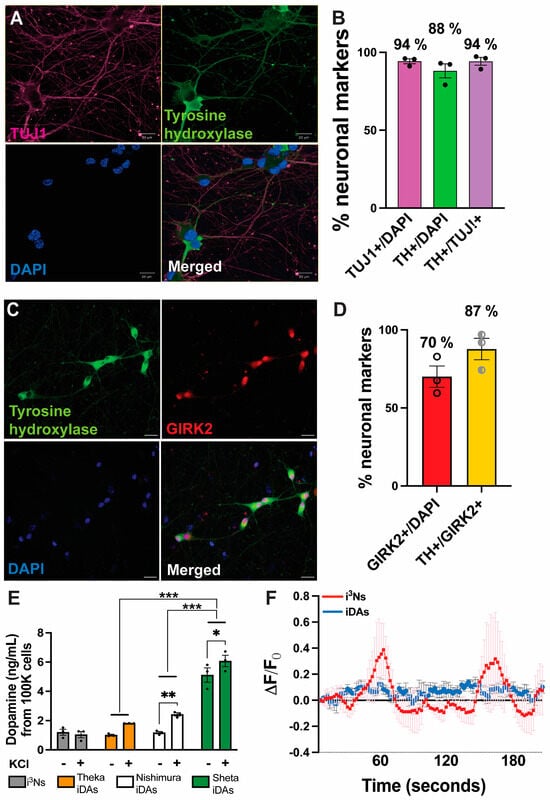 Differentiation of iPSCs into iDAs following Sheta et al. (A) iPSC-derived day 21 iDAs were stained with TUJ1 (class III β tubulin, neuronal marker), tyrosine hydroxylase (dopaminergic neuronal marker), and DAPI (nuclear stain). (B) Quantification of TUJ1+ (over DAPI+), TH+ (over DAPI+), and TUJ1+ cells that were also TH+ cells in day 21 iDAs following Sheta et al. Percentages show the proportion of cells positive for respective markers. (C) Day 21 iDAs were stained with tyrosine hydroxylase (dopaminergic neuronal marker), GIRK2 (G protein-activated inward rectifier potassium channel 2, dopaminergic neuronal marker), and DAPI (nuclear stain). (D) Quantification of GIRK2+ (over DAPI+), and GIRK2+ cells that were also TH+ in day 21 iDAs following Sheta et al. Percentages show the proportion of cells positive for respective markers. (E) iDAs derived from iPSCs following Theka et al., Nishimura et al., and Sheta et al. showed differential dopamine release in the presence and absence of KCl induction. i3Ns were used as a negative control. (F) Quantification of change of fluorescence (∆F/F0) over time from calcium signalling experiments in i3Ns and iDAs. Data are presented as mean ± standard error of mean. * p < 0.05, ** p < 0.01, *** p < 0.001. Scale bar 20 μm.