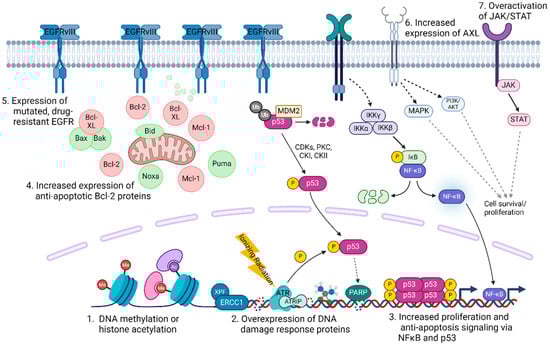 Another pathway with potential therapeutic targets is the Janus kinase (JAK)-signal transducer and activator of the transcription (STAT) pathway [,]. This pathway has been reported to be involved in both cetuximab and cisplatin resistance. Secretion of interleukin-6 (IL-6) and other cytokines activate the JAK/STAT pathway and promote stemness and survival cues in cancer cells and subsequent resistance to cisplatin treatment []. In cisplatin-resistant cells, STAT1- and STAT3-induced aldo–keto reductase family 1 member C1 (AKR1C1) was associated with cisplatin response and was a poor prognostic indicator in patient samples []. Cells with induced resistance to cetuximab overexpressed STAT3, and its knockdown resensitized cells []. Similar results were found by another group using cetuximab-resistant cells, and biopsies from cetuximab-resistant patients showed increased STAT3 activation []. Griso et al. state that STAT3, along with NF-κB activation, is more common in HPV- HNSCC []. A STAT3 targeting antisense oligonucleotide, Danvatirsen, is currently in phase II clinical trials for HNSCC and has been shown to enhance immune activation in combination with PD-L1 inhibitors (NCT05814666) [].