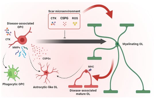 Pathological mechanisms contributing to remyelination failure in glial scar. Microglia and astrocytes contribute to the scar microenvironment by secreting pro-inflammatory CTKs, CSPGs and ROS that inhibit OPC differentiation and induce a disease-associated phenotype in OPCs and mature OLs. Disease-associated OPCs overexpress MMPs, release CSPGs and acquire phagocytic functions and astrocyte-like phenotype instead of generating new myelinating OLs. Together, all these pathological mechanisms lead to remyelination failure. OPC = oligodendrocyte precursor cells; OL = oligodendrocyte; CTK = cytokines; CSPG = chondroitin sulphate proteoglycans; ROS = radical oxygen species; MMP = matrix metalloproteinases; MHC = major histocompatibility complex. Dashed arrows indicate cell conversions. Red arrows point to events which are detrimental to remyelination. The black arrow indicates OPC maturation (i.e., transition toward a myelinating OL state).