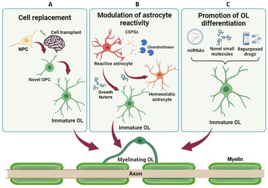 Therapeutic strategies to promote remyelination and lesion resolution. (A) NPC transplantation has the potential to restore myelination and neuronal connections, replacing damaged cells. (B) Modulation of astrocyte reactivity and promotion of their transdifferentiation toward the oligodendroglial fate can reduce the levels of inhibitory factors, promoting axon regeneration and endogenous remyelination. (C) Promotion of OPC differentiation and/or inhibition of pathologically altered mechanisms aim at fostering endogenous remyelination and, in turn, protect axons from damage. NPC = Neural progenitor cell; OPC = oligodendrocyte precursor cells; OL = oligodendrocyte; CSPG = chondroitin sulphate proteoglycans.