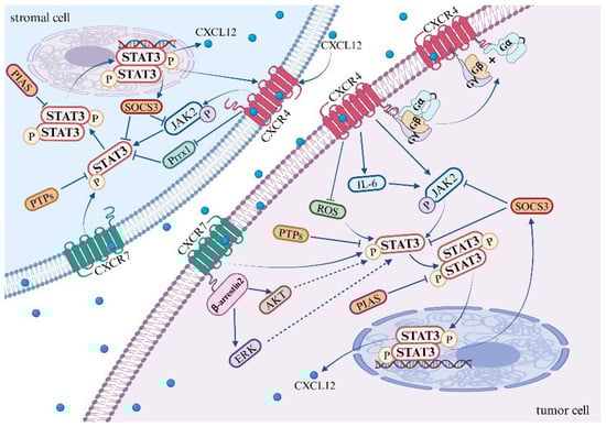 The CXCL12/CXCR4/ACKR3 signaling axis and the STAT3 pathway are intimately linked with immune regulation and the malignant progression of a variety of diseases, encompassing skin disorders, brain injuries, myocardial damage, and tumors [24,77]. Within this context, the CXCL12/CXCR4/ACKR3 axis exerts both positive and negative effects through the activation of STAT3. Moreover, the activated STAT3 pathway can augment CXCL12 expression, playing a pivotal role in the progression of these diseases. Understanding the relationship between the CXCL12/CXCR4/ACKR3 axis and the STAT3 pathway could lead to new therapeutic targets for innovative cancer treatments