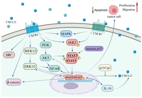 The expression of CXCL12 is also modulated by the STAT3 signaling pathway. Activated STAT3, by upregulating CXCL12, promotes tumor cell migration. Immunosuppressive cytokines (such as IL-10, PD-L1, and TGF-β) activate the STAT3 signaling pathway, leading to tumor immune suppression and epithelial–mesenchymal transition. Consequently, CXCL12 expression is enhanced in primary tumors [132]. In related studies involving fibroblasts, both aging and p53 mutations activate the STAT3 pathway in fibroblasts, leading to increased secretion of CXCL12. This induction of CXCL12 contributes to the acquisition of cancer-associated fibroblast (CAF) characteristics, ultimately promoting tumor growth and metastasis [133,134].