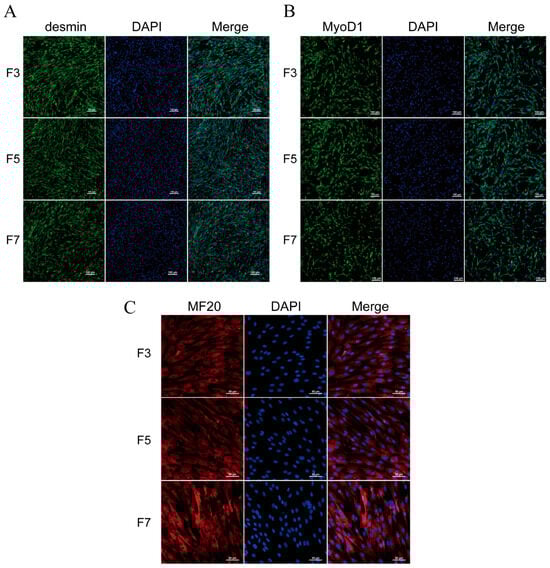Immunofluorescence staining of skeletal muscle satellite cells. (A) Desmin and (B) MyoD1 immunofluorescence staining on F3, F5, and F7 passages of skeletal muscle cells, using a magnification of 200×. (C) MF20 immunofluorescence staining on F3, F5, and F7 passages of skeletal muscle cells after three days of differentiation, using a magnification of 400×.