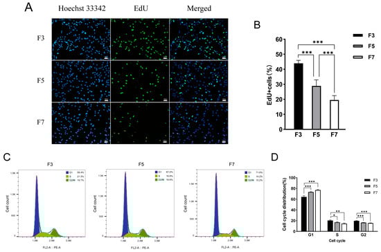 The cell proliferation potential and distribution of cell cycle phases of skeletal muscle satellite cells cultured in vitro vary across different passages. (A) Images of third-passage (F3), fifth-passage (F5), and seventh-passage (F7) pig skeletal muscle cells stained with 5-ethynyl-2′-deoxyuridine (EdU). Images were captured at 100× magnification. (B) Statistical analysis of the EdU positivity rate in cells from each passage. Data are displayed as mean ± SD, n = 9 independent experiments. *** p < 0.001. (C) Distribution of cell cycle phases among F3 (left), F5 (middle), and F7 (right) cells. (D) Quantification of the cell cycle phase distribution for each passage. Data are displayed as mean ± SD, n = 3 independent experiments. * p < 0.05, ** p < 0.01, *** p < 0.001.