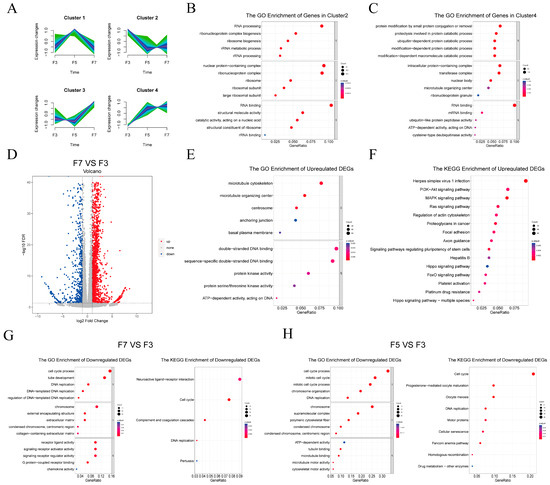 Functional analysis of differentially expressed genes across cell passages. (A) Gene clustering based on expression levels across passages. The x-axis represents the samples, while the y-axis represents centralized and normalized expression values. The mean expression trends of the genes within each cluster are depicted by the purple lines. (B,C) Gene Ontology (GO) enrichment analysis of the genes in cluster 2 (B) and cluster 4 (C). (D) Fold-change values for each gene in F7 compared to F3 cells. Gray points were not statistically significantly different between samples; red and blue points were significantly upregulated and downregulated, respectively, in F7 compared to F3 cells. Differences were considered statistically significant at |log2(fold change) ≥ 1| and false discovery rate-adjusted p < 0.05. (E,F) Functional enrichment analyses of upregulated DEGs in F7 vs. F3 group with (E) Gene Ontology (GO) annotations and (F) Kyoto Encyclopedia of Genes and Genomes (KEGG) biochemical pathway annotations. (G) Functional enrichment analyses of downregulated DEGs in F3 vs. F7 group with GO annotations and KEGG biochemical pathway annotations. (H) Functional enrichment analyses of downregulated DEGs in F5 vs. F3 group with GO annotations and KEGG biochemical pathway annotations.