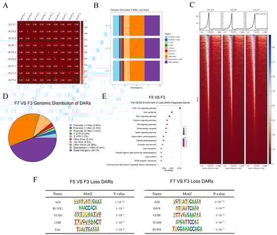 Differentially accessible chromatin regions (DARs) in seventh-passage (F7) and fifth-passage (F5) compared to third-passage (F3) cells. (A) Pairwise Pearson’s correlation for all nine samples (three replicates for each of the F3, F5, and F7 passages). (B) Genomic distribution of open chromatin peaks in each passage of cells. Functional regions were categorized as follows: promoter (≤1 kb), promoter (1–2 kb), 3′ untranslated region (UTR), 5′ UTR, first exon, other exon, first intron, other intron, downstream (≤300 Kb), and distal intergenic region. (C) Visualization of open chromatin signals within a 3 kb window surrounding the peak center. TSS, transcription start site; TES, transcription end site. (D) Genomic distribution of DARs in F7 vs. F3 gruop. (E) Kyoto Encyclopedia of Genes and Genomes (KEGG) classification of genes with decreased chromatin accessibility in F5 vs. F3 gruop. (F) Enriched transcription factor binding motifs in F5 and F7 compared to F3 cells.