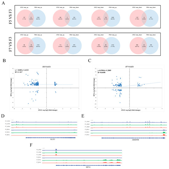 Integrated epigenomic and transcriptomic analysis. (A) Overlap between significantly differentially expressed genes (DEGs) and differentially accessible chromatin regions (DARs). ATAC-seq_down, genes that were less accessible in fifth- or seventh-passage (F5 and F7, respectively) cells compared to third-passage (F3) cells; ATAC-seq_up, genes that were more accessible in F5 or F7 than F3 cells; RNA-seq_up, DEGs that were upregulated in F5 or F7 compared to F3 cells; RNA-seq_down, DEGs that were downregulated in F5 or F7 compared to F3 cells. (B,C) Correlations between DEGs and genes within DARs in (B) F5 and (C) F7 compared to F3 cells. (D–F) Integrative Genomics Viewer snapshots showing chromatin peaks and RNA sequencing read levels for specific regions of (D) SLIT3, (E) ARID5B, and (F) MFN1. All three genes were differentially expressed in F5 and/or F7 compared to F3 cells, but showed no significant differences in chromatin accessibility.