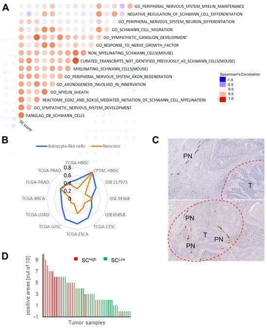 Establishment of the SC-related 43-gene set as a surrogate for peripheral nerve abundance in the TME of HNSCC. (A) Spearman’s correlation coefficient matrix for GSVA scores of the SC-related 43-gene set and indicated gene sets related to the peripheral nervous system based on bulk RNA-seq data from TCGA-HNSC. (B) Spider plot showing the correlation coefficients comparing the GSVA scores of the SC-related 43-gene set and scores for astrocytes (blue color) and neurons (orange color) based on xCell deconvolution for TCGA-HNSC, four independent HNSCC cohorts, and other solid tumors from TCGA. (C) Representative images of an IHC staining with an anti-GAP43 antibody show a positive staining (brown signal) in peripheral nerve fibers (PN) adjacent to and within the tumor area (T, marked by a dashed red line) of FFPE tumor sections. Histological staining with hematoxylin to visualize tissue architecture. (D) Bar plot shows quantitative assessment of positive areas of peripheral neurons adjacent to and within the tumor and demonstrates an increase in the number for HNSCC with a high SC score (SChigh, red, n = 25) as compared to a low SC score (SClow, green, n = 25).