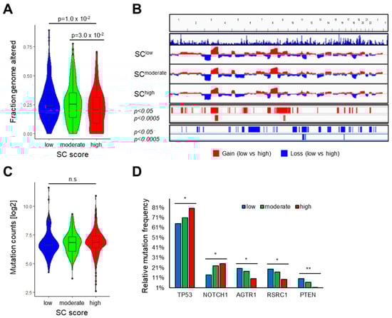 Differences in the mutational landscape for tumors from TCGA-HNSC with low, moderate, and high SC scores. (A) Violin plot shows statistically significant differences in the fraction of genome altered for HNSCC with low, moderate, and high SC scores. (B) Frequency plots summarize copy number gains (red) and losses (blue) and indicate hotspot regions with significant differences between tumors from TCGA-HNSC with high and low SC scores. (C) Violin plot shows no statistically significant difference in mutation counts for HNSCCs with low, moderate, and high SC scores. (D) Bar plot illustrates MutSig genes (TP53, NOTCH1, AGTR1, RSRC2, PTEN) with statistically significant differences in somatic mutation frequency among HNSCCs with low, moderate, and high SC scores. Statistical differences in the fraction of genome altered and mutation counts were determined by ANOVA-Tukey HSD, while the significant differences in relative mutational frequency were determined by chi-square test with * p < 0.05, ** p < 0.005 and n.s. = not significant.