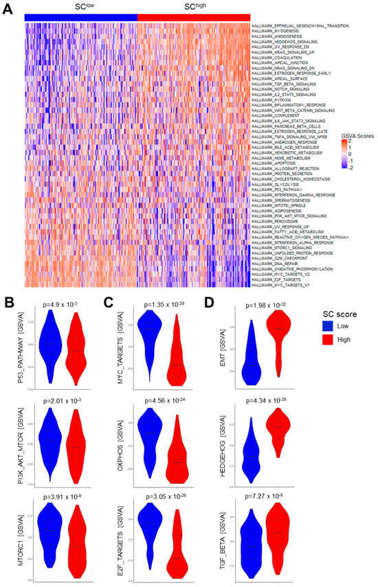 Differences in gene regulatory networks and oncogenic pathway activity associated with different SC scores for tumors from TCGA-HNSC. (A) Heatmap showing an unsupervised hierarchical cluster analysis based on GSVA scores of top-ranked MSigDB hallmark gene sets with significant differences between tumors with high or low SC score. (B–D) Violin plots show statistically significant differences between tumors with high or low SC scores for indicated gene sets in TCGA-HNSC. Statistical significance was determined using the Wilcoxon rank test.