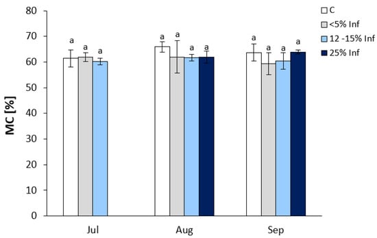 No significant changes in MC were observed in the infected leaves compared to the respective controls (Figure 1). In July, oak leaves infected with E. alphitoides showed an increase in <5% Inf and a decrease in 12–15% Inf compared to controls. In leaves obtained in August, a decrease in MC was observed in the <5% Inf, 12–15% Inf, and 25% Inf categories compared to the control. In September, an increase in MC was observed only in 25% Inf.