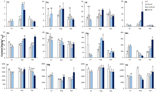 The analysis revealed significant effects of the E. alphitoides infection on the elemental composition of the oak leaves (Figure 2). Interestingly, Cr, Ni, Zn, Mn, and Mg contents were significantly affected by the time point and degree of infection. Concerning the elemental content of oak leaves, only K was not affected by E. alphitoides infection at all time points. In July, the contents of Cr, Cu, Al, Ni, P, Mg, and Ca were more or less stable and were not significantly affected by E. alphitoides infection. Furthermore, at this time point, the results showed significantly increased contents of Mn in the <5% Inf and 12–15% Inf tested groups and of Fe in the <5% Inf tested groups, and significantly decreased contents of Zn and Na in infected leaves, compared to the respective controls. In August, the content of seven elements (Cr, Al, Ni, Zn, Na, Mn, and Fe) was significantly affected by E. alphitoides infection. The pathogen caused an increase in Cr, Zn, and Na in the 12–15% Inf and 25% Inf groups, and an increase in Al and Ni in the 25% Inf group. At the same time, E. alphitoides infection decreased Mn in 12–15% Inf and 25% Inf and Fe in 25% Inf. Other elements (Cu, P, Mg, and Ca) were not significantly affected by E. alphitoides infection. In September, the contents of Cr, Cu, Al, Ni, Fe, and Na were more or less stable and were not significantly affected by E. alphitoides infection. Compared to the respective controls, a significant increase in Zn was observed in the 5% and 25% Inf groups, as well as in Mn, Mg, and Ca in the 25% Inf group. At the same time, E. alphitoides infection decreased the P content in the 5% Inf and 25% Inf test groups compared to the respective controls.