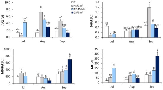 The increase in DHAR activity was observed in <5% Inf leaves obtained in September compared to the control (Figure 3). In leaves obtained in July, a significant decrease in DHAR activity was observed in <5% Inf and 12–15% Inf compared to the control. In August, there were no significant changes in DHAR activity between control and infected leaves.