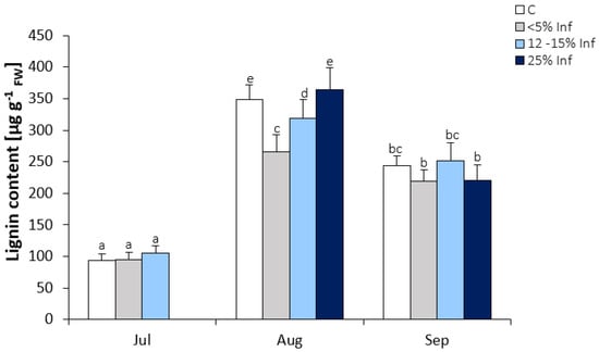 A significant increase in lignin content was observed in leaves collected in August and September (Figure 4). In July, no significant changes in lignin content were observed in infected leaves compared to the control. In August, there was a significant decrease in the lignin content in <5% Inf and 12–15% Inf and no significant increase in 25% Inf compared to the control. In September, no significant changes in lignin content were observed between control and pathogen-infected leaves.