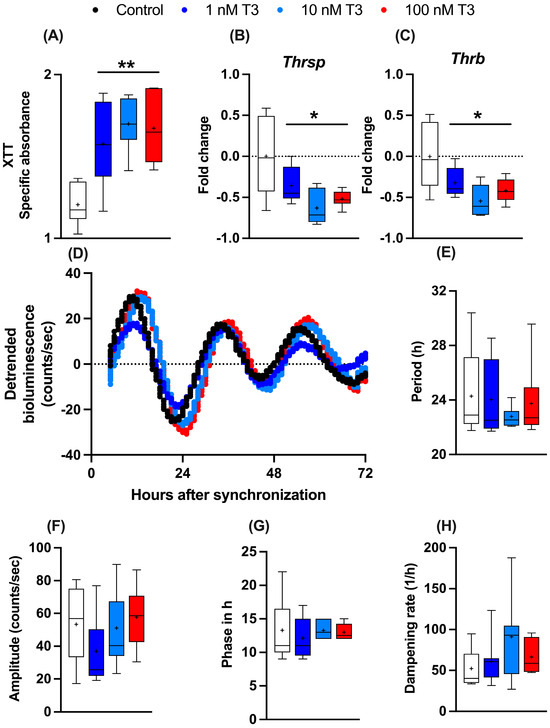Effects of T3 on hepatocyte metabolism and gene regulation. (A–C) Analysis of metabolic activity using XTT assay and expression levels of thyroid hormone-responsive genes (non-log transformed), Thrsp and Thrb (n = 6 per group). (D–H) Evaluation of Bmal1:Luc bioluminescence rhythm parameters in response to increasing concentration of T3 (n = 6–10 samples per group). Boxplots show the median, mean (+), quartiles, maximum, and minimum expression values. * Represents one-way ANOVA followed by two-stage linear step-up procedure of Benjamini, Krieger, and Yekutieli post-test against the control group. * q < 0.05 and ** q < 0.01.