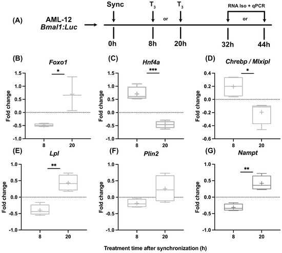 While in line with published findings [19] that indicated subtle effects of T3 on liver clock function, we tested if hepatocytes show different metabolic responses to T3 treatment when treated at different times of the day. After dexamethasone synchronization, hepatocytes were treated with T3 either after 8 h or 20 h, corresponding roughly to early morning and evening conditions in vivo, respectively. RNA was harvested 24 h later and analyzed (Figure 2A). Although we found a dose-independent effect for T3 on mitochondrial activity, we decided to use the highest dose of T3 (100 nM) since the incubation period of the following experiments was reduced to 24 h. We selected three genes encoding for metabolically relevant transcription factors (Foxo1, Hnf4a, and Chrebp) and three further metabolic regulator genes (Lpl, Plin2, and Nampt) reported to be hepatic TH target genes and/or identified as altered under low and/or high TH conditions [19,27,28,29].