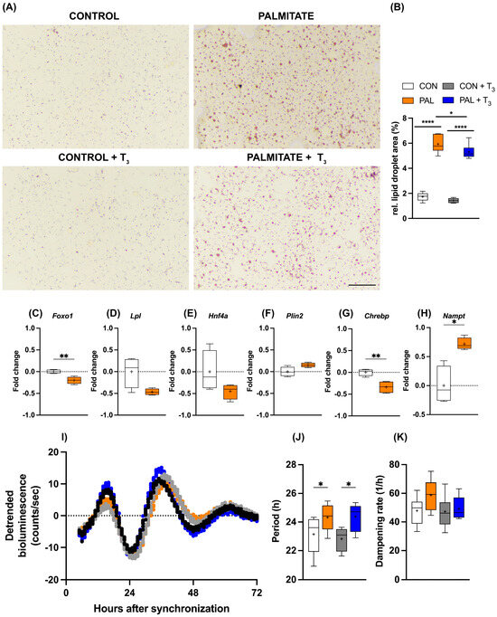 As outlined above, TH signaling is a candidate target for the treatment of MASLD in human patients. Against this background, we wondered whether the observed temporal gating of T3 action in AML-12 cells would persist under steatosis conditions. The addition of palmitate to the culture medium increased cellular lipid deposition in AML-12 cells, and simultaneous T3 administration attenuated this effect (Figure 3A,B). Induction of steatosis also affected metabolic gene expression. Foxo1 and Chrebp mRNA levels were significantly reduced under palmitate, while a similar trend was observed for Lpl and Hnf4a (p < 0.1). In contrast, Nampt showed increased expression in response to palmitate treatment (Figure 3C–H). Palmitate incubation had a slight lengthening effect on the period of the circadian clock of AML-12 cells, which was not further affected by T3 (Figure 3I–K).