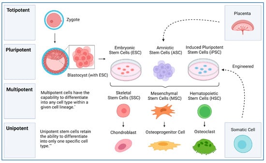 Multipotent stem cells are cells that have the capability to differentiate into any cell type within a given cell lineage []. These cells are naturally found throughout the human body and are often harvested from different cell lineages. These cells can be classified into three primary categories: mesenchymal stem cells (MSCs), hematopoietic stem cells (HSCs), and neuronal stem cells []. However, our review focuses on MSCs, HSCs, and a more recently discovered skeletal stem cell (SSC) as these are the primary cells implicated in bone healing [,].