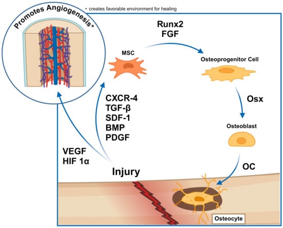MSCs are responsible for formation of mesenchymal lineage cells, including osteoblasts, chondroblasts, adipocytes, and other types of stromal cells. Numerous cytokines have been shown to play an important role in bone growth and regeneration. Some of the key growth factors include Transforming Growth Factor (TGF)-β, Hypoxia-Inducible Factor (HIF) 1-α, Chemokine Receptor Type 4 (CXCR-4), Stromal Cell-Drive Factor (SDF)-1, Runx2, osterix (Osx), osteocalcin (OC), platelet-derived growth factor (PDGF), bone morphogenic protein (BMP), and vascular endothelial growth factor (VEGF) [,]. The role of these growth factors in the context of bone regeneration was characterized in depth by Setiawan et al. []. These growth factors are stored and released from either the stem cell secretome or extracellular vesicles (EVs) during the inflammatory phase of the fracture healing process. Following fracture, released PDGF promotes proliferation of MSCs and facilitates MSC osteogenic differentiation and migration to the injury site by downregulating PDGFα expression and depressing BMP–Smad1/5/8–Runx2/Osx axis signaling []. TGF-β1 also helps to recruit MSCs to migrate through Smad signaling in both the bone formation and remodeling phases for restoring bone homeostasis [].