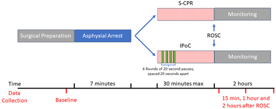 Next, cardiopulmonary resuscitation (CPR) began by reinitiating ventilation now with 100% oxygen and randomization into standard CPR (S-CPR) or IPoC CPR protocols. In the IPoC protocol, after an initial standard CPR period of 40 s, interrupted chest compression cycles began. These included a 20 s pause in chest compressions followed by 20 s of reinitiating compressions comprising 1 round for a total of 4 rounds. After the 4 rounds of IPoC, compressions were continued in accordance with the standard CPR protocol as previously described [