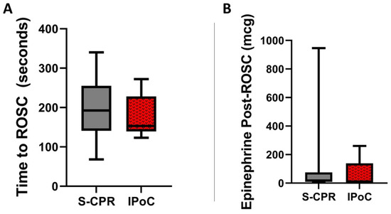 Figure 2A. Delivery of epinephrine to maintain mean arterial pressure at a minimum of 70 mmHg demonstrates the recovery of the heart after arrest. Less epinephrine would indicate a better resuscitation or mitigation of damage. The quantity of inotropic support in the form of epinephrine drip to maintain a MAP of 70 mmHg was not significantly different, 19.2 mcg (8.7–75.8) in S-CPR v. 11 mcg (2.9–138.7) in IPoC,