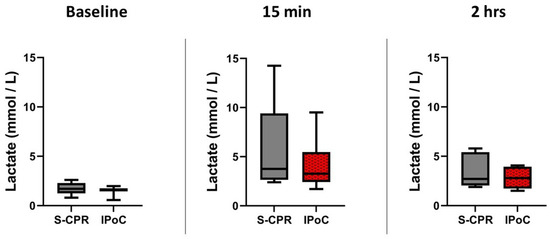−1 (2.1–5.2) in S-CPR. This demonstrates the clearing of lactate and rescuable phenotypes. Ns = 8/8, 8/7 and 6/6 for S-CPR/IPoC at each time point, respectively.
