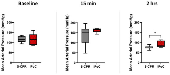 MAP is the most commonly evaluated parameter as an indication of recovery post arrest. There was no significant difference between groups at baseline (standard cardiopulmonary resuscitation (S-CPR) 113 mmHg (standard deviation (SD) 14) vs. ischemic post-conditioning (IPoC) 119 mmHg (SD 27),