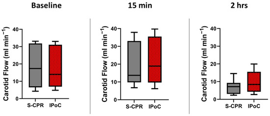 p = 0.87. Carotid flows did not differ at 15 min after ROSC,