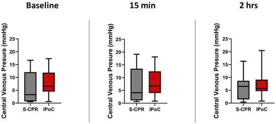 CVP can be used as a marker of right heart failure, especially after an insult such as asphyxial cardiac arrest. Here, there were no significant changes across time points or between groups either before or after arrest. At baseline, the median CVP was 4.7 mmHg (interquartile range (IQR) 1.1–13.0) in the standard CPR group (S-CPR), as compared to the ischemic post-conditioning (IPoC) group, where the median was 7.0 mmHg (3.9–13.6),