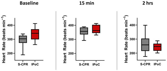 There were no baseline differences in any hemodynamic or vital sign parameter. The rate of ROSC was identical between groups; eight of nine animals achieved ROSC in each group. All animals that survived suffered severe bradycardic arrest or pulseless electrical activity. In the two animals that did not achieve ROSC, this electrical activity quickly became fine ventricular fibrillation and then asystole. Time to return of spontaneous circulation (ROSC) is a marker of overall ischemic time and insult. The duration of CPR or time to ROSC was not statistically different, S-CPR 193 s (141–255) as compared to 153 s (139–228) with IPoC,