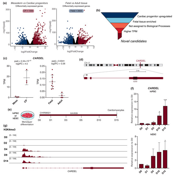 Taking advantage of our previously published RNA-seq dataset [17], we narrowed our search for cardiac developmental genes, looking at the genes that were differentially expressed between the mesoderm and cardiac progenitor (CP) stages of the in vitro differentiation (IVD) of hPSC. Analysis of publicly available RNA-seq data from human fetal and normal adult heart tissues was also performed as a second step to limit the genes to those mainly expressed during heart development (Figure 1a). Genes that showed upregulation in CP cells (1354 genes, Table S1A) and were found to be enriched in fetal heart tissues (3503 genes, Table S1B) were considered potential candidates (intersection = 151 genes, Table S1C). Among those genes are well-known fetal-enriched genes such as TNNI1, which is the fetal isoform expressed in cardiac and skeletal muscle during early development [26]. As our primary goal was to find novel and uncharacterized genes, Gene Ontology analysis was used to filter out genes assigned to known biological processes (Table S2). Following these criteria (Figure 1b and Figure S1a), we chose CARDEL, which had no prior cardiac link, for investigation of its possible functional relevance to cardiac commitment (Figure 1b).