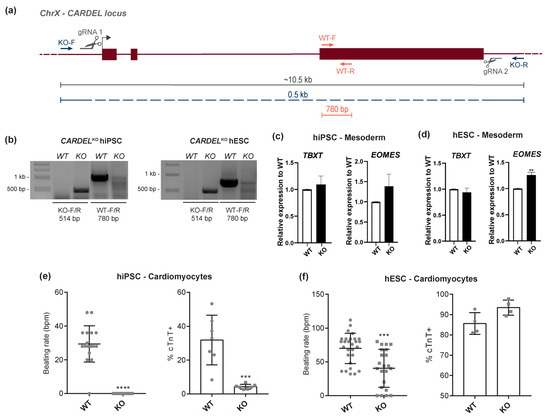 The functional activity of a genomic locus can be investigated at several levels: (1) DNA, through, for example, examination of regulatory sequences (e.g., promoters and enhancers); (2) RNA, through, for example, examination of non-coding roles either in cis or in trans; and (3) protein. Considering that the CARDEL locus has been uncharacterized to date, we first aimed to assess whether the transcribed CARDEL sequence was necessary for cardiac specification. To this end, we established two CARDEL knock-out (CARDELKO) lines (H1 hESC and IPRN13.13 hiPSC) using CRISPR/Cas9 technology (Figure 2a). Cleavage in both gRNA target sequences could be detected by PCR using primers up and downstream of those sequences (KO-F/R), as well as internal primers (WT-F/R) (Figure 2a,b). CARDELKO lines showed normal karyotypes, typical pluripotent colonies and expression of pluripotent genes, indicating that the lack of CARDEL expression does not affect pluripotency or genome stability (Figure S2a,b). In addition, depletion of CARDEL expression was confirmed by RT-qPCR when CARDELKO cells were subjected to the cardiac IVD assay (Figure S2c).