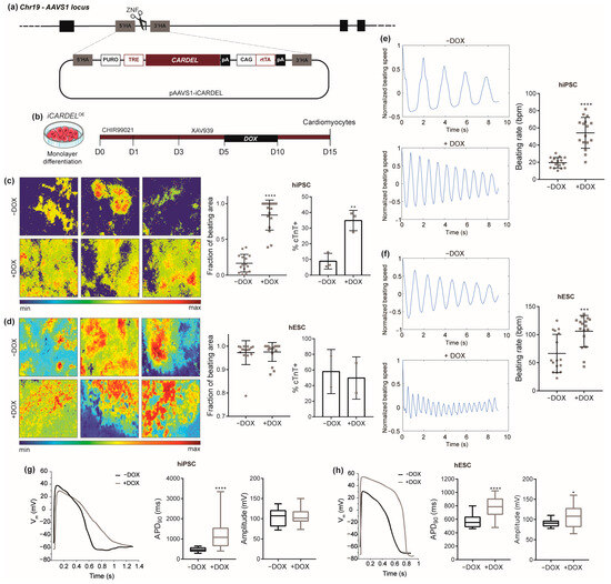 CARDEL overexpression improves hPSC cardiomyogenic differentiation and alters cardiomyocyte functional properties. (a) Schematic representation of dox-inducible system knock-in at the AAVS1 locus. (b) Cardiac IVD protocol used to differentiate cardiomyocytes from dox-inducible iCARDELOE cells. The time is indicated in days. (c,d) iCARDELOE hiPSC- (c) and hESC-derived (d) cardiomyocytes differentiated under control (−DOX) or induced (+DOX) conditions. Representative images of the intensity of beating areas according to the heatmap scale in the bottom (left). Quantification of beating areas (center). Quantification of cTnT-positive cells by flow cytometry (right). (e,f) Representative plots of beating frequency (left) and quantification of beating rate in iCARDELOE hiPSC- (e) and hESC-derived (f) cardiomyocytes differentiated under control (−DOX) or induced (+DOX) conditions. (g,h) Action-potential profiles of iCARDELOE (g) hiPSC- and (h) hESC-derived ventricular cardiomyocytes under control (−DOX) or induced (+DOX) conditions. Mean with SD; Student’s unpaired t-test analysis: * p < 0.05, ** p < 0.01, *** p < 0.001, **** p < 0.0001.