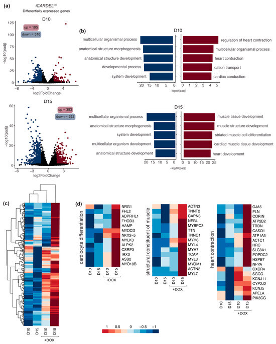 CARDEL contributes to molecular changes during cardiomyocyte differentiation. (a) RNA-seq analysis of iCARDELOE hiPSC-derived cardiomyocytes differentiated under control (−DOX) or induced (+DOX) conditions. Volcano plots show differentially expressed genes for −DOX versus +DOX: upregulated in red, downregulated in blue (padj < 0.05, −1.5 ≥ log2FC ≥ 1.5). (b) Genome ontology (GO) analysis of upregulated (red) and downregulated (blue) sets of genes. The five most representative GO terms are shown. (c) Heatmap and cluster of upregulated genes in D15. (d) Heatmap of upregulated genes in D15 related to specific GO terms, as indicated. Values are plotted as log2 of normalized counts by DESeq2.