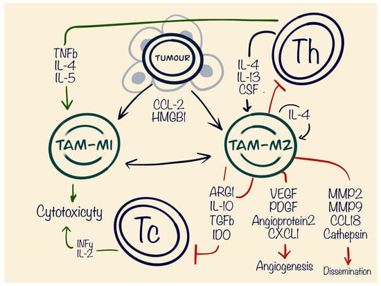 The role of tumour-associated macrophages is strongly dependent on their polarisation and factors dominating in the TME. They may transition from anti-tumourous type M1 to the pro-tumourous M2 type and suppress cytotoxic T cells, promoting tumour proliferation and dissemination.