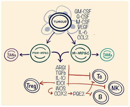 Myeloid-derived suppressor cells cause immunosuppression in the TME by inhibiting cytotoxic T cells and NK cells, as well as the ability of B cells to present tumour antigens. MDSCs also stimulate proliferation of T regulatory cells and indirectly suppress immune response against malignant cells. The ability to transform into tumour-associated macrophages or neutrophils increases their negative impact.