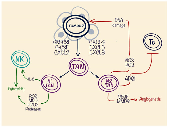 Tumour-associated neutrophils can directly induce tumour cytotoxicity or stimulate NK cell infiltration, but at the same time, the N2 type enhances DNA instability, increases angiogenesis, and suppresses cytotoxic T cells, which makes them pro-tumourous.