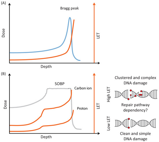 Illustration of depth dose and LET distribution of particle beams. (A) Pristine Bragg peak (blue curve) with increasing linear energy transfer (LET; orange curve) at the distal dose fall-off. (B) Spread-out Bragg peak (SOBP; dotted curve) with typical LET profiles for clinical carbon ion and proton beams (orange curves). Examples of DNA damage caused by high- and low-LET irradiation are shown to the right.