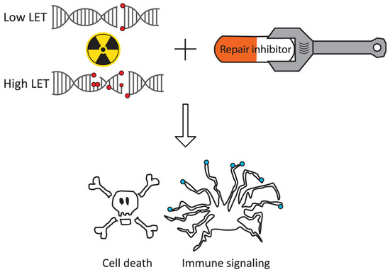 However, more recent studies indicate that DNA repair is highly important even after high-LET irradiation [18,19]. Combination treatment with DNA repair inhibitors is thus relevant for both carbon ions and protons. Here, we discuss potential differences in repair signaling after high- and low-LET irradiation that may impact such treatments (Figure 2). We also examine previous preclinical work involving DNA repair inhibitors combined with proton or carbon ion irradiation. Moreover, we discuss how such combination treatment may promote antitumor immune signaling. We propose that DNA repair inhibitors are useful in combination with particle radiotherapy, causing tumor radiosensitization and enhancing antitumor immune effects.