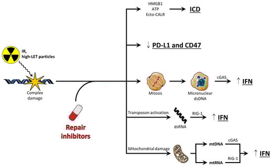 Potential mechanisms of increased antitumor immune signaling following treatment with DNA repair inhibitors and high-LET radiation. DNA repair inhibitors include inhibitors of cell cycle checkpoints. IFN: interferon; ICD: immunogenic cell death. Small, vertical errors indicate changes in occurrence of proteins.