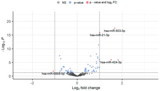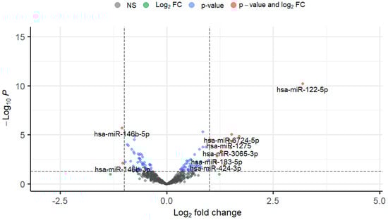 Significant differential expression of miRNAs in response to TGFβ2 treatment (5 ng/mL 24 h). Volcano Plot identifying differentially expressed miRNAs in response to TGFβ2 treatment in TM cells. A threshold was applied using a statistical significance of p < 0.05 and log2FC > 1. Grey and green dots represent miRNAs failing to meet the significance cut-off. Blue dots represent miRNAs that have met the p-value but are below the log2FC criteria. Red dots represent those miRNAs that have met the threshold with a p < 0.05 and log2FC > 1. Those on the left corner of the plot are down-regulated whilst those on the right area of the plot are the up-regulated miRNAs. Grey dots—Not Significant (NS), Red dots = p-value < 0.05 & Log2FC ≥ 1, Blue dots = p-value < 0.05. p-value is represented by the dashed horizontal line and Log2FC is represented by the vertical dashed lines.