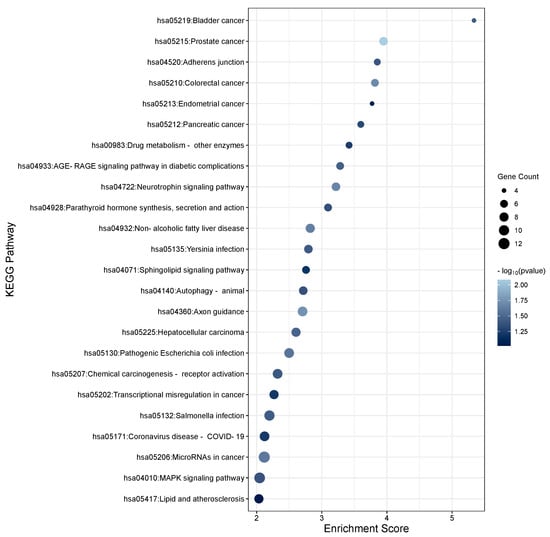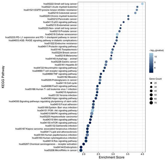 KEGG pathway analysis of significantly down-regulated TGFβ2-responsive miRNAs in TM cells. KEGG pathway analysis of the significant differentially expressed miRNAs (p < 0.05) was performed. The enrichment plot presents the top 30 KEGG pathway enrichment terms for differentially expressed miRNAs down-regulated in response to TGFβ2 in TM cells. The X-axis label represents Enrichment Score, the amount of differentially expressed genes enriched in the pathway, and Y-axis label represents the enriched pathway. The size and colour of the bubble represent the amount of differentially expressed genes enriched in the pathway and the enrichment significance.