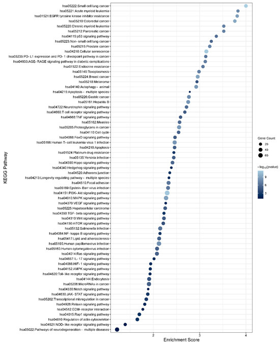 To determine the function of the TGFβ2-induced DEmiRs and the potential role they play within the TM, KEGG enrichment analysis was performed using DAVID software on the target genes of the significant DEmiRs adjusting for multiple corrections (FDR < 0.05). To gather a list of target genes for the significant miRNAs, TargetScan and miRTarbase were used to identify experimentally validated genes for significant miRNAs with a threshold of FDR < 0.05 to ensure a high confidence. The genes were added to the DAVID software to assess significant pathways. In total, 58 pathways were found to be associated with TGFβ2-regulated miRNAs. The top 30 KEGG pathways for gene targets of the up- and down-regulated TGFβ2 responsive miRNAs are shown in Figure 6 and Figure 7, respectively. Pathways relating to MAPK signalling, PI3K-Akt signalling, Hippo signalling, Wnt signalling, focal adhesion, apoptosis, cellular senescence, and regulation of the actin cytoskeleton are relevant to POAG pathogenesis and are listed in Table S4 (significantly up-regulated miRNAs) and Table S5 (significantly down-regulated miRNAs) along with the associated miRNAs and gene targets.